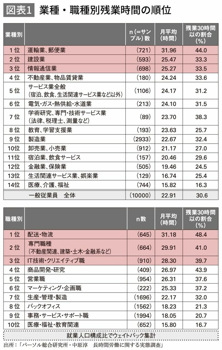 まず、残業が多い業種は想像通りかもしれないですが、1位が運輸業・郵便業、2位が建設業、3位がIT企業などの情報通信業でした。どこも人手不足が伝えられており、皆さんもニュースでよく目にするでしょう。職種で見ても、1位が配送・物流、2位が専門職種(不動産関連、建築・土木系、金融系など)、3位がIT技術・クリエイティブ職となっていて、業種のランキングとおおよそ重なります。ちなみに、この調査における「残業時間」とは休日出勤も含め「所定労働時間を超えて働いた時間」を指しています。