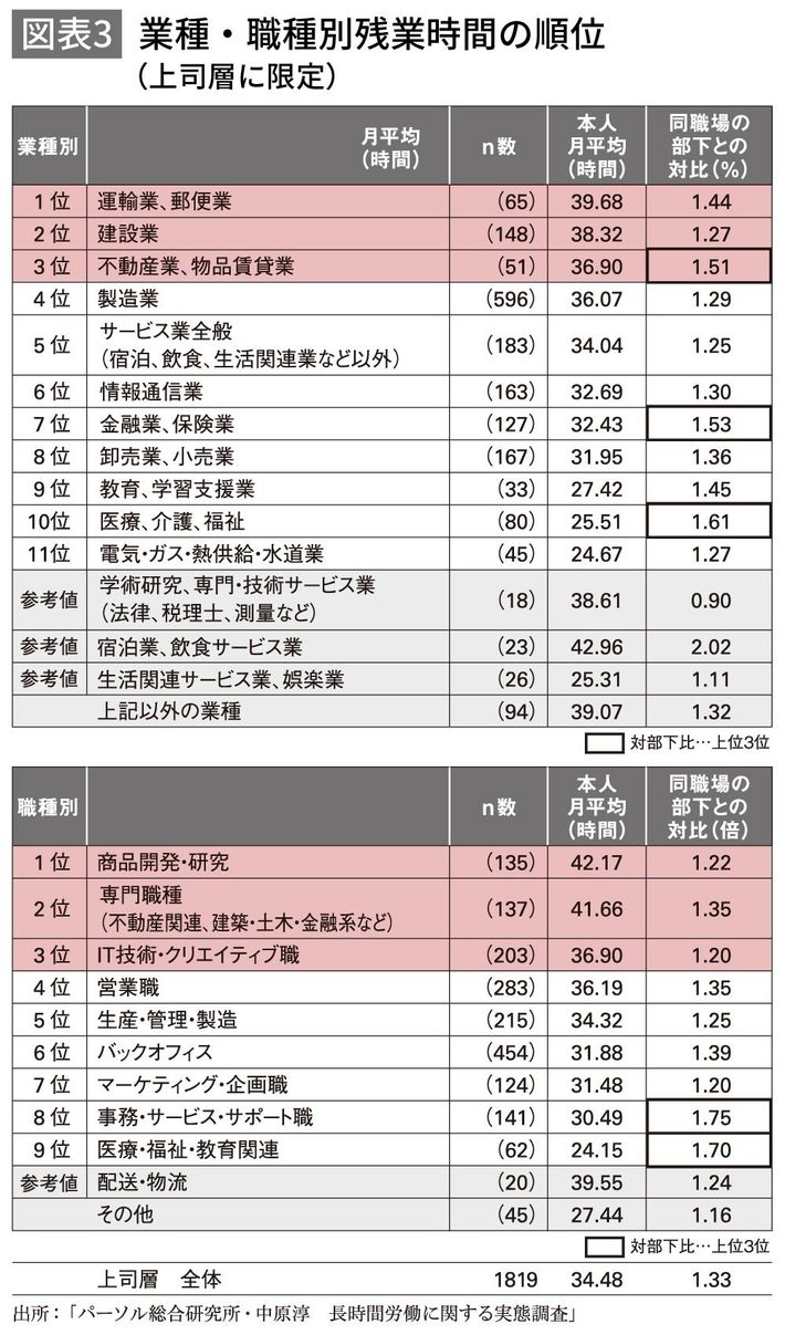 「うちの上司はもっと残業している」という声も聞こえてきそうですが、先ほどのデータは、役職のない一般従業員だけのものです。残業をしている上司層(主任クラス以上)を対象にした調査(図表3)では1位は運輸業、郵便業、2位が建設業、3位が不動産業、物品賃貸業となり、現場の部下たちが帰った後にもう一仕事する管理職たちの姿が浮き彫りになります。さらに部下に比べて上司の残業の比率が高い業種をピックアップしてみると、医療・介護・福祉や金融業・保険業、教育、学習支援業などがあがってきました。これらの業種では、マネジャーたちが部下の約1.5倍も残業しているようです。
