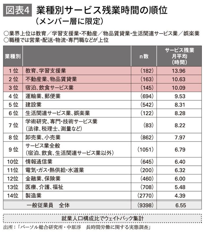 調査の結果、残業時間の中でもサービス残業の割合が多い業種として浮かび上がったのが、教育・学習支援業、不動産業、物品賃貸業、宿泊・飲食サービス業でした(図表4)。