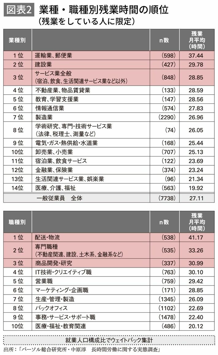 見ての通り、残業をしている人だけに限れば数字が増えるのです。例えば運輸業・郵便業は平均37.4時間、建設業は29.8時間。人によっては、これらの数字がより実感をもって受け止められるかもしれませんね。