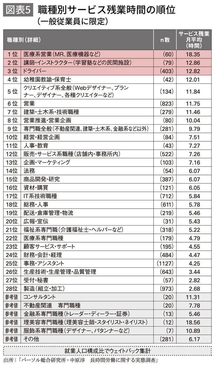 また、サービス残業時間が多い職種は1位が医療系営業(MR、医療機器など)、続いて講師・インストラクター(学習塾など)、ドライバー、幼稚園教諭・保育士となっていて、ここでも人に直接関わる教育系の仕事にサービス残業が多いことが見てとれます(図表5)。
