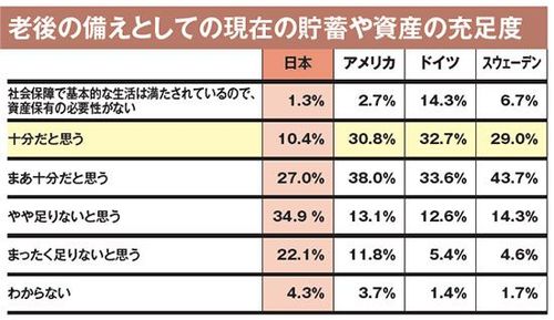 とはいえ、日々の忙しさにかまけ、老後の準備が進んでいないのが日本人の実態だ。「高齢者の生活と意識に関する国際比較調査」(内閣府)の結果はなかなか興味深い。日本、アメリカ、ドイツ、スウェーデンの60歳以上を対象にしたこの調査で「老後の生活費に対する備え」を尋ねたところ、「特に何もしていない」の割合が断トツで高かったのが日本人だ(日本42.7%、アメリカ20.9%、ドイツ26.1%、スウェーデン25.4%)。