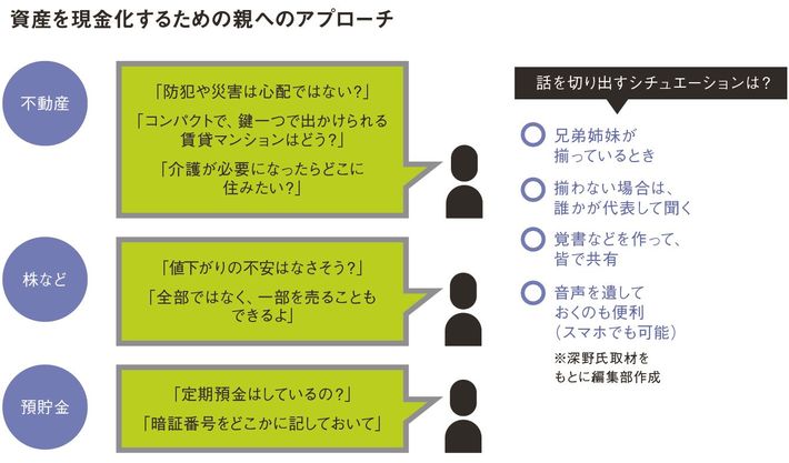 預貯金は定期預金のままだと解約に手間取ることになりかねず、ある程度の年齢になったら普通預金に移しておいたほうが無難。取引銀行が多いと相続時の手続きが大変なので、整理すると同時に暗証番号も聞いておきましょう。