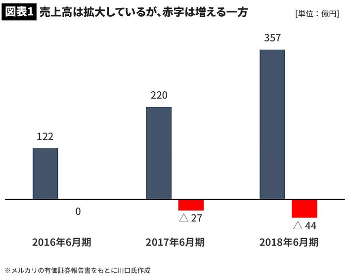 メルカリの連結損益計算書(PL)の推移を見ると、売上高は毎年順調に増加している。ところが営業利益は赤字つづきである。しかもその赤字幅は、縮小するどころか広がる一方だ(図表1参照)。