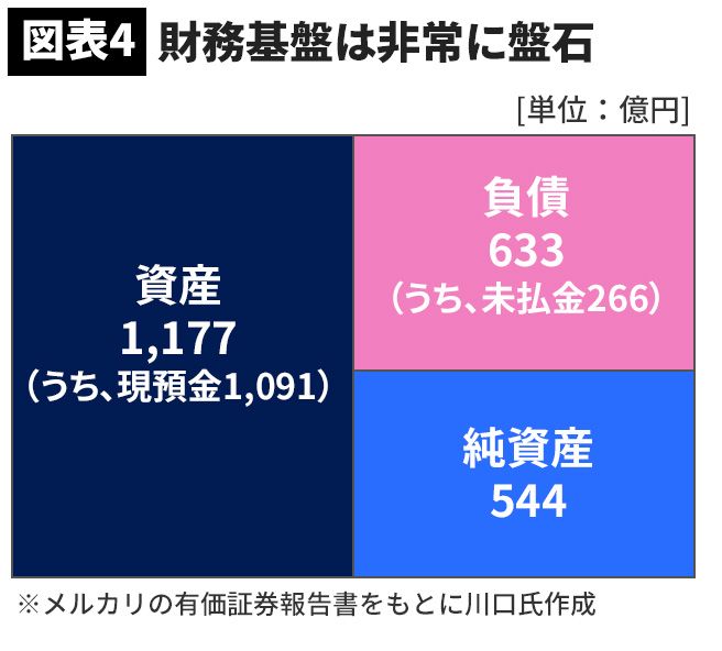 連結貸借対照表(BS)を見ると、資産総額1177億円のうち、1091億円が現預金だとわかる(図表4参照)。つまりメルカリは、資産のほとんどがキャッシュで成り立っている“超キャッシュリッチ企業”なのだ。