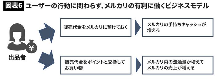 つまり、ユーザーがどっちに転んでもメルカリに有利に働く。非常に精巧に作られたビジネスモデルである(図表6参照)。メルカリの決済サービス「メルペイ」がはじまれば、このビジネスモデルはさらに強固になるだろう。