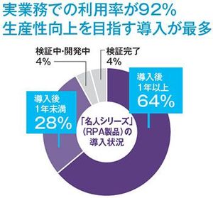 日本にはすでに15年の実績を持つ“国産RPA”が存在する。ユーザックシステムの「名人シリーズ」だ。昨年リリースされた「Autoジョブ名人」を筆頭に、現在700社超が導入。ライセンス購入後の実業務での利用率は92%。テスト導入の利用だけにとどまらず、一度導入した企業では基盤システムとして着実に定着している。