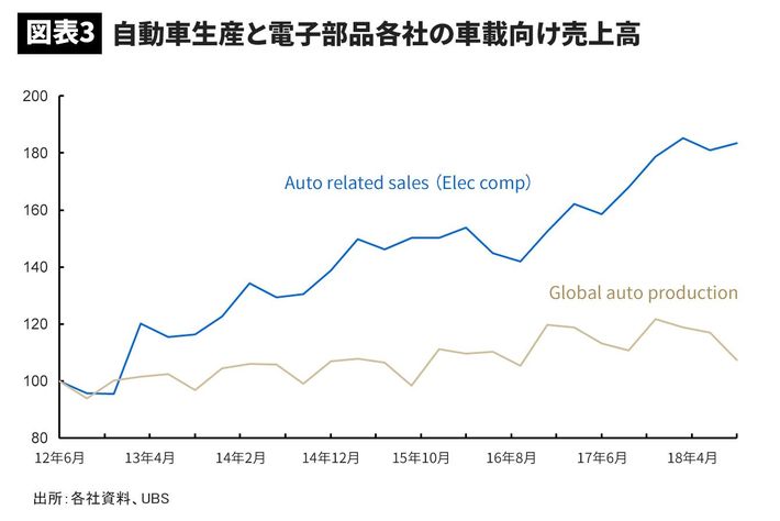以上の状況から、スマートフォン分野での事業環境は当面厳しそうである。これを受けて電子部品セクター各社の株価は低調に推移しているが、反転の兆しはないのであろうか。その鍵は自動車分野にある。