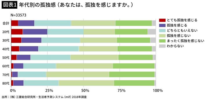 三菱総合研究所では生活者情報データベース「生活者市場予測システム(mif)」(※1)を活用し、2018年に「あなたは、孤独を感じますか」というアンケート調査を行った(サンプル数は女1万5511人、男1万8062人、年齢層は20代~80代)。