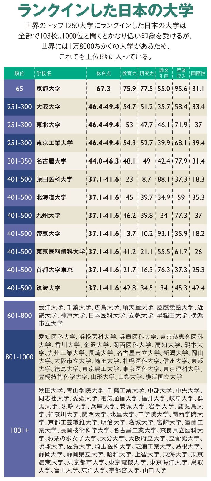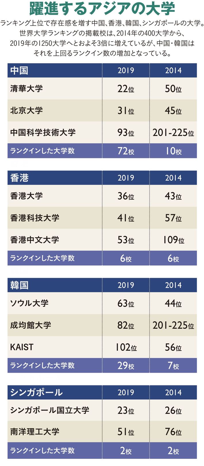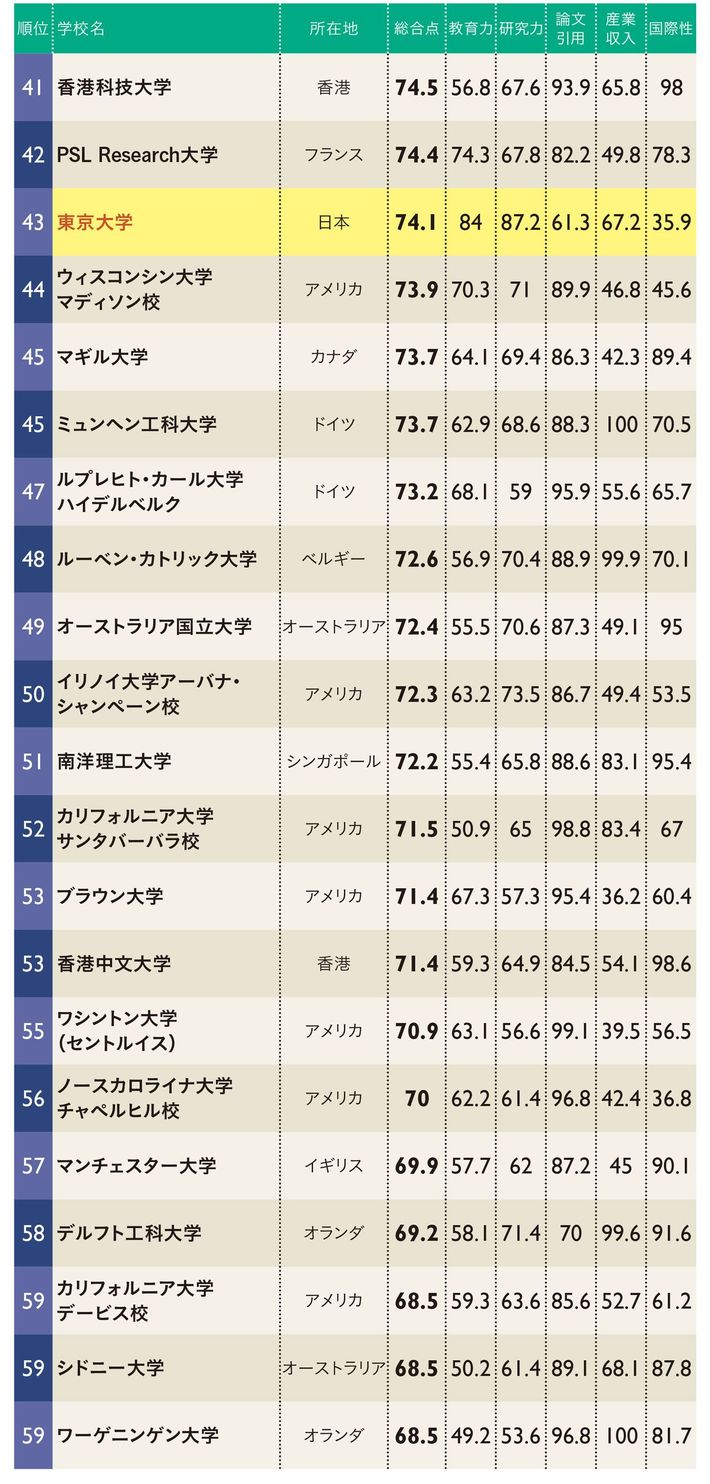 親技のカガク #東京大学 #大学 2019/03/14 9:00 #133 #134 #135 #136 #137 #138 世界ではマイナー"ガラパゴス東大"の凋落 世界43位に低迷、アジアでも6位 プレジデント ファミリー 加藤 紀子 +フォロー 教育情報サイト「リセマム」編集長 前ページ 1 2 3 4 5 「世界大学ランキング」41~60位と東大以外の日本の大学の順位 (写真=iStock.com) 【関連記事】 "頭のいい子を潰す"熱い親のヤバい声かけ 中学受験のMARCHシフトが加速する理由 東大と京大では合格者の質が正反対なワケ なぜ頭のいい子は、モノを平気で壊すのか 難関中学が合否をウェブで発表しない理由 1 2 3 4 5 『プレジデントFamily』 2019年春号 受験・進学 大激変! AMAZONで購入する PRESIDENT Storeで購入する 加藤 紀子(かとう・のりこ) 教育情報サイト「リセマム」編集長 1973年京都市生まれ。1996年東京大学経済学部卒業。国際電信電話(現KDDI)に入社。その後、渡米。帰国後はフリーランスライターとして中学受験、子どものメンタル、英語教育、海外大学進学、国際バカロレア等、教育分野を中心に「プレジデントFamily」「ReseMom」「NewsPicks」「ダイヤモンド・オンライン」「『未来の教室』通信」(経済産業省)などさまざまなメディアで取材、執筆。初の自著『子育てベスト100』(ダイヤモンド社)は17万部のベストセラーとなり、韓国、中国をはじめ6カ国・地域で翻訳されている。その他著書に『ちょっと気になる子育ての困りごと解決ブック!』(大和書房)、『海外の大学に進学した人たちはどう英語を学んだのか』(ポプラ新書)がある。 <この著者の他の記事> 高校3年間を通して「羅生門」しか読まなくていいのか…灘中学の国語科教師が懸念する"文学離れのマズさ" 関連記事 "頭のいい子を潰す"熱い親のヤバい声かけ 中学受験のMARCHシフトが加速する理由 東大と京大では合格者の質が正反対なワケ ランキング 1位 1回10分・室内でもできる…整形外科医が「姿勢も血流もよくなる」と勧める"肋骨ウォーキング"の効果【2026年1月BEST】 ランキングをもっと見る 政治・経済 #東京大学 #大学 #ランキング #学校・教育問題