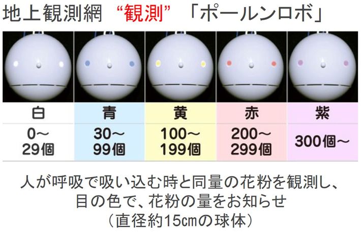 WN社が開発した花粉観測機で現在7代目。2005年に初代を開発して以来、代を重ねるごとに性能は進化した。2019年に本格稼働した最新型では、専用アプリを使えば1時間ごとの飛散量が計測できる。ロボの目の色が、花粉の量によって5段階に変化するのも特徴だ。