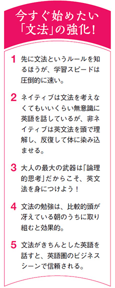 一方、論理的な思考が必要な英文法の勉強は、脳の働きが冴えている朝の時間帯に集中して取り組むと効果的だという。文法を強化する重要性について、関先生は次のように指摘する。