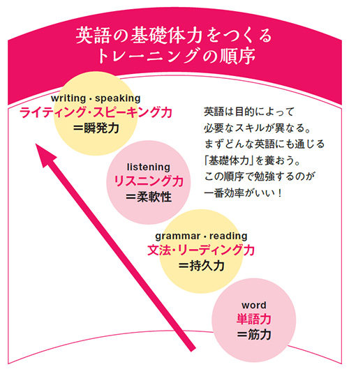 「英語はダイエットと同じで、短期間ではなかなか結果は出ません。その事実から目をそらさない覚悟が必要です。今のままでは勉強が足りないから伸びないんだと自覚すれば、途中で心が折れることもありません。そのうえで大事なのは、リスニングやスピーキングに取り組む前に、英語の基礎体力とでもいうべき、単語、文法、リーディングの力を徹底的に身につけておくことです」