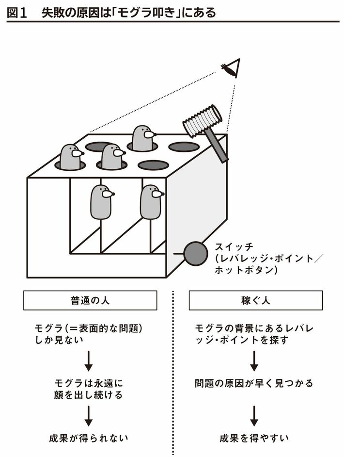 彼らは目に見える問題に目を向けることを嫌う。表面的な問題に一時的に対処したとしても、必ず同じ問題が発生することを知っているからだ。すべての問題の裏側には一見、目に見えないものの本質が常に存在している。だからこそ、その一点の追求に時間をかける。ゆっくりと問題の根っこを突き止め、一気に問題の息の根を止めることができるのだ。100個のタスクをこなすのではなく、たった一つの最も重要な因子(レバレッジ・ポイント/ホットボタン)を見つけてそこに注力すること、それが彼らの方法だった(図1)。