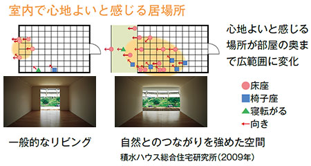 積水ハウスの総合住宅研究所では実際に実物大の空間で実験を行い、リビングの居心地を研究しています。戸外の自然とつながることにより、心地よいと感じる場所が広範囲に広がる効果を科学的に検証しました。