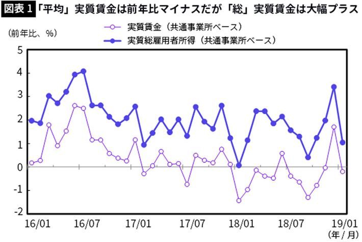 現在の日本で発生していることはまさにこういうことだ。若年層・高齢者層および非正規の雇用が増加している結果として、全体「平均」を取ってしまうと上昇率が鈍く見えてしまう。こうした「数字のアヤ」を排除すべく、別の統計(労働力調査)で公表されている雇用者数を掛け合わせ、日本全体の実質「総」所得を計算してみよう。下図に示す通り、「平均」実質賃金がおおむね前年比マイナスで推移しているのとは対照的に、実質「総」所得は大幅なプラスが続いている。つまり、実態として、日本人全体が受け取る所得は実質ベースでも改善を続けているということだ。