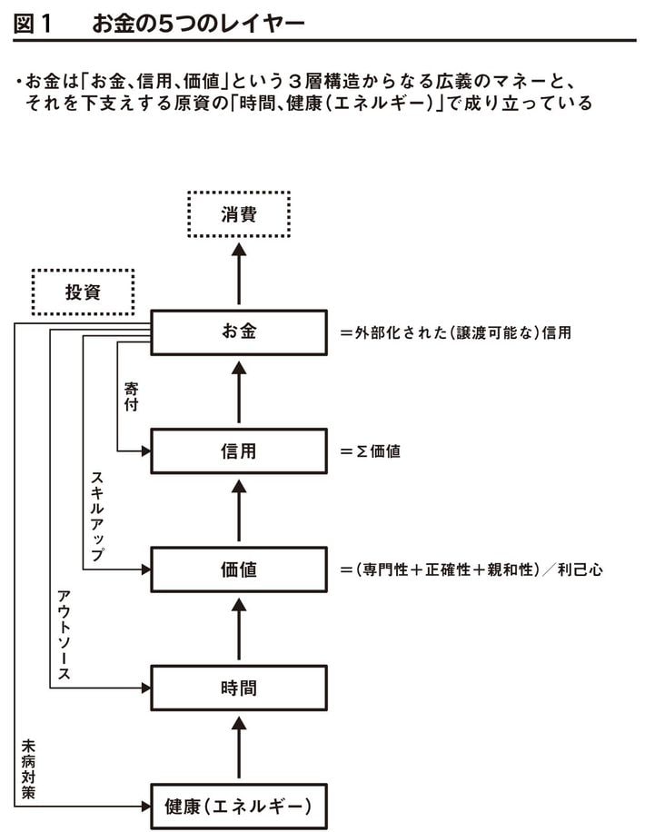 時間にせよ、健康にせよ、それらは「お金、信用、価値」という3層構造からなる広義のマネーを下支えする「原資」であり、原資であるからこそ私たちはもっとそこに意識を向けなければならない。