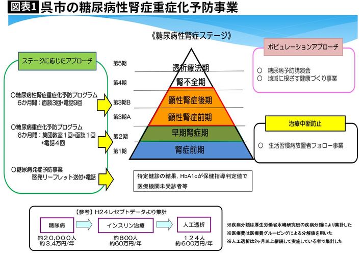 具体的には、糖尿病性腎症等重症化予防プログラム(図表1)により、血糖コントロール目標は対象者の約96.6%が維持改善している(平成26年度)。また、価格の低いジェネリック(後発医薬品)の使用促進で約2億4000万円(平成27年度)、頻回受診者訪問指導で1億4500万円の医療費削減効果があがっている。