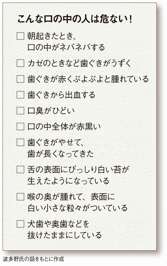 #寿命 #歯 2019/04/07 11:00 口の中でわかる"早死にする人、ボケる人" 多くのシニアが"歯"で後悔している PRESIDENT 2019年3月18日号 波多野 尚樹 +フォロー 慈皓会・波多野歯科医院院長 前ページ 1 2 3 4 ▼シニア1000人「『歯』で後悔」 (構成=南雲つぐみ 撮影=奥谷 仁 写真=iStock.com) 【関連記事】 "気軽に抗生物質&ロキソニン"が怖いワケ 富裕層は「スマホ」と「コーヒー」に目もくれない ヤバい病院は「待合室」を見ればモロバレ 「最近、妻が老けた」と感じていたら注意 医師の本音「ヤバい病院は検査でわかる」 1 2 3 4 波多野 尚樹(はたの・なおき) 慈皓会・波多野歯科医院院長 1946年生まれ。日本歯科大学卒業。医学博士・歯学博士。MAXIS インプラント インスティチュート主幹。日本のインプラント治療のパイオニアの1人で、即日完成インプラントを開発。 関連記事 "気軽に抗生物質&ロキソニン"が怖いワケ 富裕層は「スマホ」と「コーヒー」に目もくれない ヤバい病院は「待合室」を見ればモロバレ ランキング 1位 芦田愛菜さんのせいではない…大コケ「果てしなきスカーレット」で再燃する細田守監督作品の「女性描写」問題 ランキングをもっと見る ライフ #寿命 #歯 #歯周病 #細菌 #健康