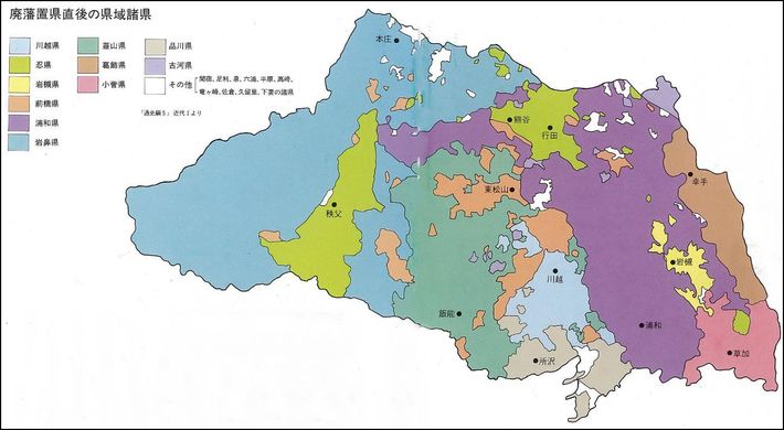 明治元年、戊辰戦争に勝利しつつあった新政府は、諸藩の領地はそのままに、幕府や旗本の旧領に新たに県を置いた。1871(明治4)年には廃藩置県を行い、藩を県とした。その後、同年10月から11月にかけて大規模な府県統合が行われ、錯綜した支配の解消が行われた。埼玉県は11月14日に誕生、現在ではこの日が埼玉県民の日となっている。