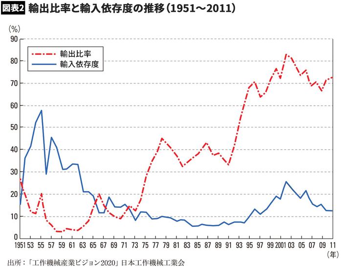 また、輸出比率と輸入依存度の観点からも、日本の工作機械産業の国際競争力の向上を観察できる。表2は、日本の工作機械の輸出比率と輸入依存度の金額ベースの推移を示したものだ。輸出比率とは、生産高のうち、輸出高の比率を示している。一方、輸入依存度とは、内需のうち、輸入高の割合を示している。