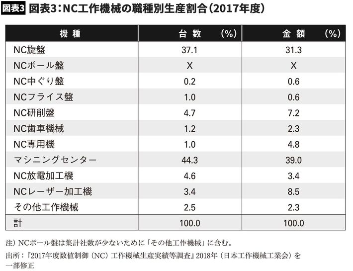 次に多い機種はNC旋盤で、全体の約3割を占めていることがわかる。旋盤は円柱状の被切削物を回転させ、バイトと呼ばれる工具で切削加工をする工作機械である。現在の日本では、この二つの機種で全工作機械生産高の約8割程度を占めている。また、現在日本で生産される工作機械のほとんどは、NC装置が付いたNC工作機械である。