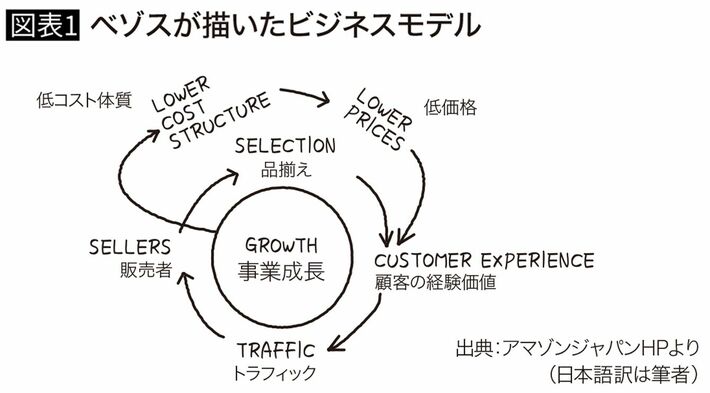 この図表では、「セレクション(品揃え)」を増やして顧客の選択肢が増えれば顧客満足度が上がり、「カスタマーエクスペリエンス(顧客の経験価値)」が高まること、そして顧客の経験価値が高まると「トラフィック」が増え、アマゾンのサイトに人が集まること、すると「セラー(販売者)」がアマゾンのサイトでモノを売りたいと考えて集まってくること、それによって「品揃え」が増えて「顧客の経験価値」が上がるというサイクルが描かれています。