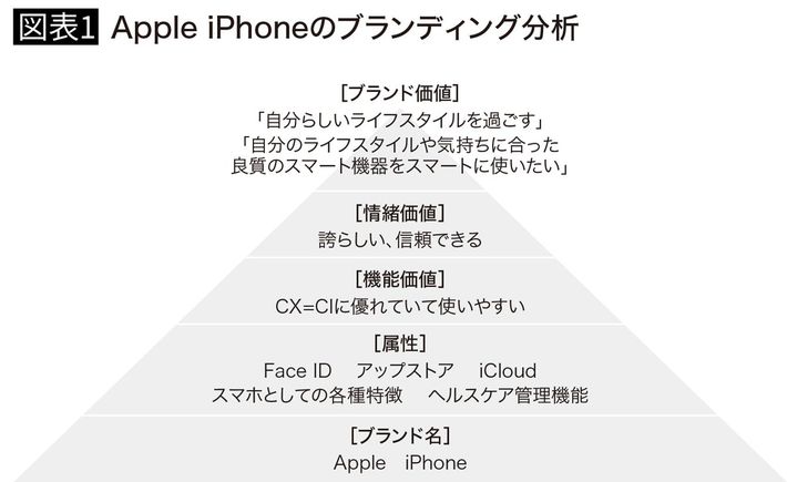 図表1はラダリングというフレームワークでアップルのiPhoneを代表例としてブランディング分析したものです。優れたブランドは、名称から、属性(特徴や実績)、機能価値、情緒価値、ブランド価値に至るまですべての階層で顧客価値に優れています。