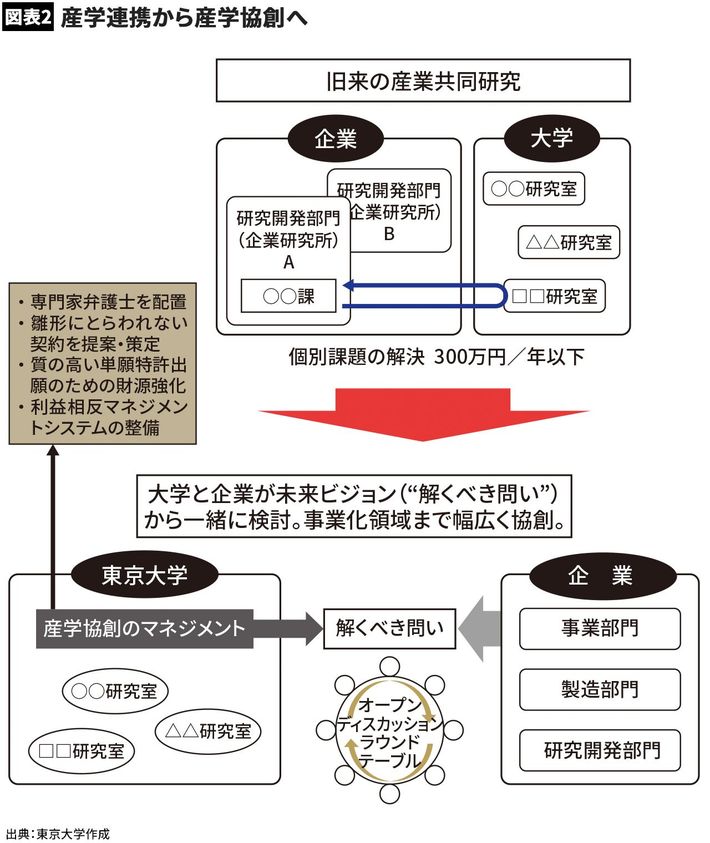 大学という公共財を社会のために活用するという観点から、せっかくなら「産学連携」ではなく、さらに踏み込んだ「産学協創」を目指したいと私は考えています(図表2)。旧来の産学連携では、先に述べたとおり、企業と大学の研究室がボトムアップで個々に連携していました。しかし、東大の提唱する「産学協創」では、トップ同士が実現すべき未来社会像を共有した上で、企業と大学がそれぞれ組織レベルで協働し、そこに向かうための具体的な連携を進めることを目指しています。