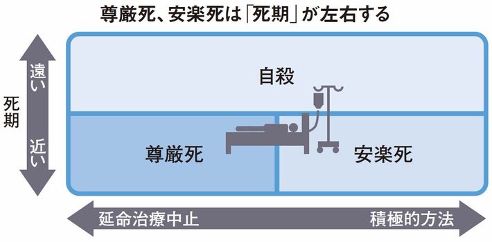 患者が自ら死を選ぶケースは、安楽死、尊厳死、自殺の3つ。尊厳死と安楽死は混同されやすいが、薬物などで積極的に命を絶つのが安楽死、延命治療を中止して自然に死を迎えるのが尊厳死だ。