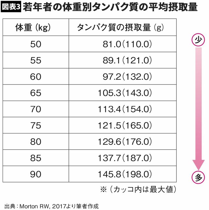 一方、ムーアらが示した係数で計算すると、1食当たりの最適なタンパク質摂取量は16.8gとなります。さらに、一般的な筋トレは多関節トレーニングが中心となるため、ムーアらの単関節トレーニング由来の数値に10gをプラスし、1食当たりの摂取量は約27gとなります。