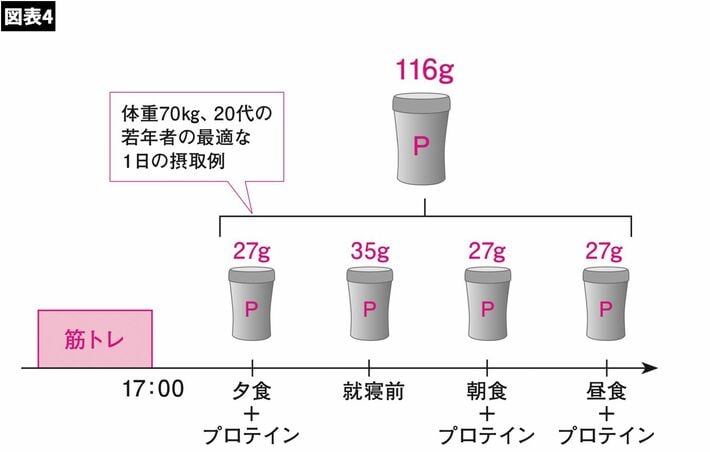 夕方にトレーニングを行った場合、その後の夕食で27gのタンパク質を摂取します。さらに、寝る前にプロテインで35gを摂取して、翌日の朝食と昼食に27gずつ摂取すると筋トレ後の24時間におけるタンパク質摂取量は116gとなります。