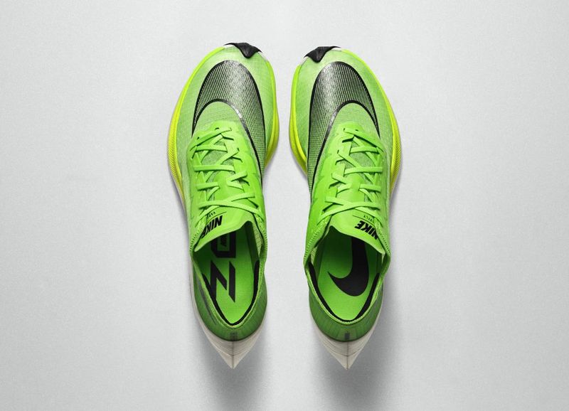 彼らが履いていたグリーン色のシューズは、4月24日に発表された「ズームエックス ヴェイパーフライ ネクスト%」というモデル。以前、キプチョゲが世界記録を樹立したときに履いていた「ズーム ヴェイパーフライ4% フライニット」は、前モデルからアッパー部分を伸縮性のあるフライニットという布地に変えただけだったが、今回はかなりアップデートした。