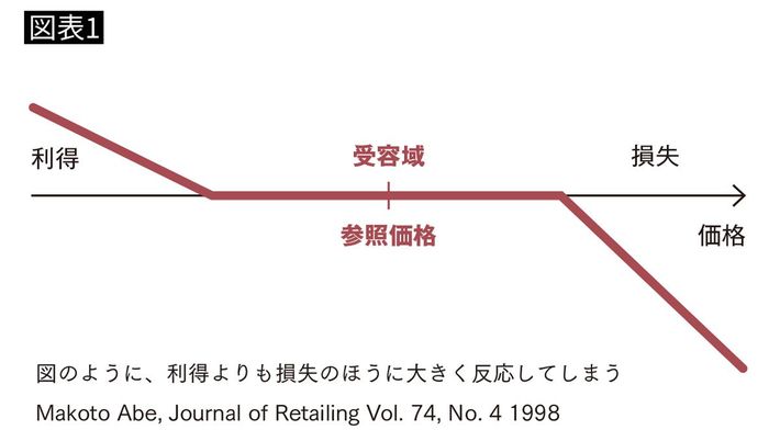 たとえば内的参照価格が1万円だとして、9000円や1万1000円の場合は安いとも高いとも感じにくいですが、8000円や1万2000円になると、途端に安いと感じたり高いと感じたりする、ということです。参照価格より価格が高い場合は「損失」、参照価格より価格が低い場合は「利得」と知覚されます。