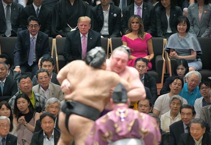 問題のツイートは日本時間26日の午後、つぶやかれた。安倍氏と千葉県茂原市の「茂原カントリー倶楽部」でゴルフを楽しみ、クラブハウスでダブル・チーズバーガーをほおばった後のツイートだ。「両国国技館で大相撲を観戦する前」と説明した方が分かりやすいかもしれない。