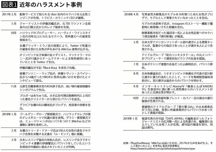 そう、今まではずっとあったことだったのです。でも明らかに周囲の環境は変わっています。変化に目を向け、自分をアップデートしないとついていけません。特に2017年から2018年は、変化の年でした。今までの海外と日本での#MeTooの流れをまとめてみました〔(図表1)スポーツ関連などパワハラも一部含んでいます〕。