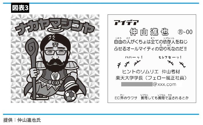 図表3のように、人気スナック菓子のおまけシール風の名刺を持っています。「ナカヤマシンヤ」というロゴと、デフォルメされたご自身のオリジナルイラストが描かれています。