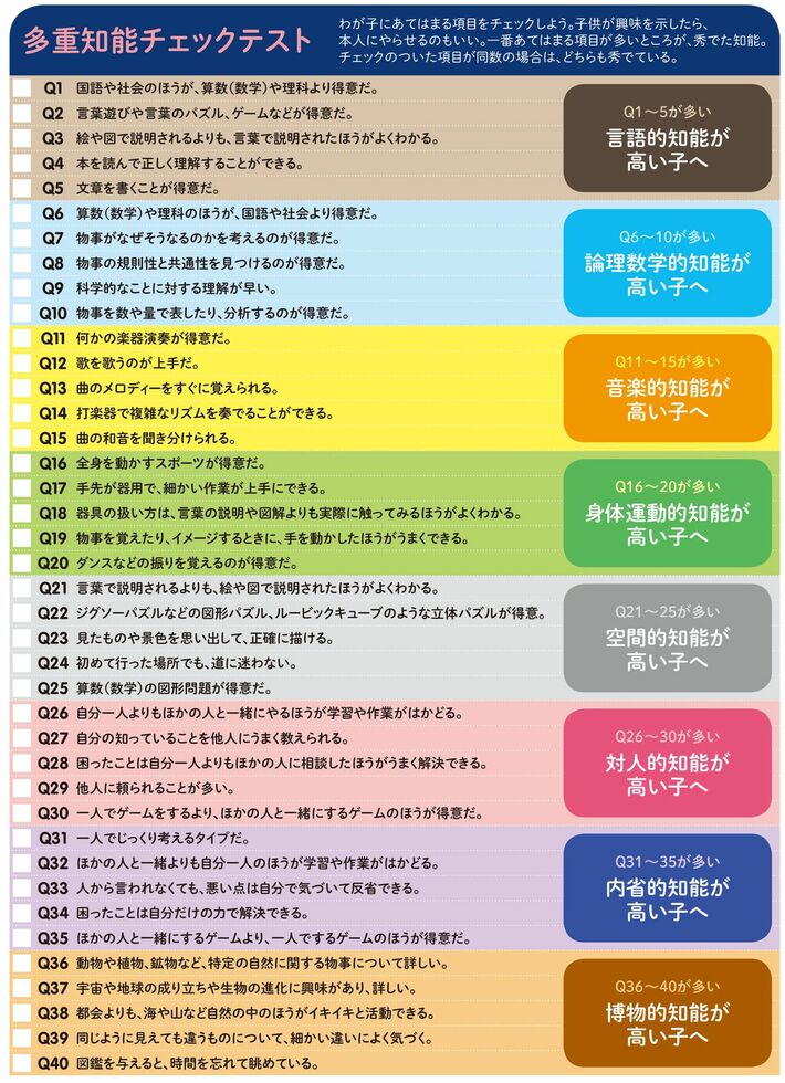 最初に、自分の子供がどの知能が秀でているか別表でチェックしてほしい。各知能の有無を調べるべく、松村さん監修のもと、それぞれ5つのチェック項目を用意した。該当する項目が一番多いところが、秀でた知能ということになる(チェックのついた項目が同数の場合はどちらも秀でている)。知能は複合的なので、いくつか当てはまりそうなものがあればどれも試してみよう。