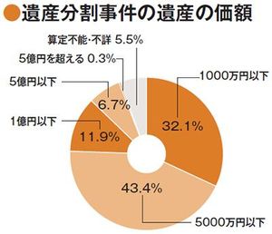 「うちの会社には心配するほどの財産はない」という声も聞くが、もめる、もめないと財産額はあまり関係がない。グラフのとおり、遺産分割の裁判のうち75.5%は遺産額が5000万円以下である。