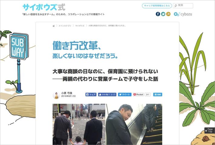 他部署から寄せられるアイデアに、編集部のメンバーがアイデアを掛け合わせて新しい価値を生み出した企画はいくつもあります。サイボウズ式の最大のヒット記事がこちらです。営業チームのメンバーが、同僚に代わって子守をした様子を描いています。