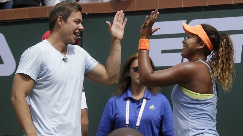 2018年3月18日、BNPパリバ・オープンでツアー初優勝を果たした大坂なおみ(右)を祝福するサーシャ・バイン・コーチ(米カリフォルニア州インディアンウェルズ)