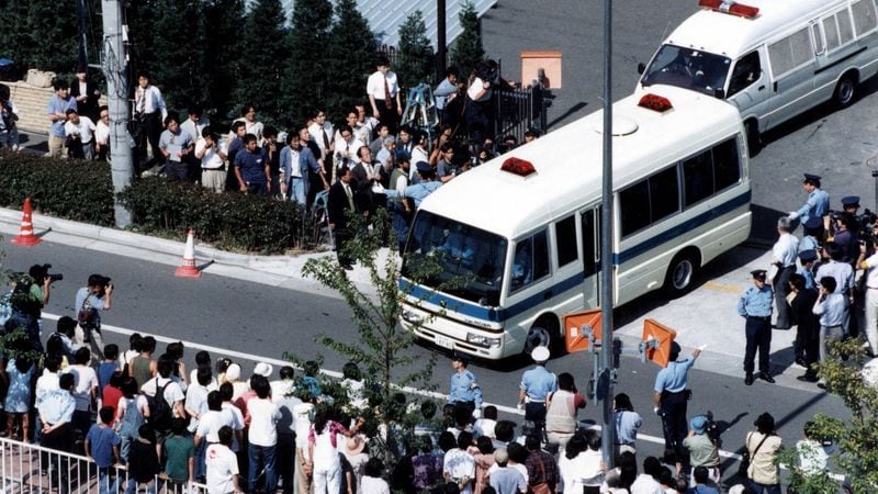 神戸小学生連続殺傷事件/須磨署から神戸地検に向かう容疑者。大勢の報道陣や住民の見守る中、神戸地検に向かう土師淳君殺害容疑者の中学生を乗せたマイクロバス=神戸市の須磨警察署前で、山下恭二写す。兵庫県/神戸市。1997年6月29日撮影