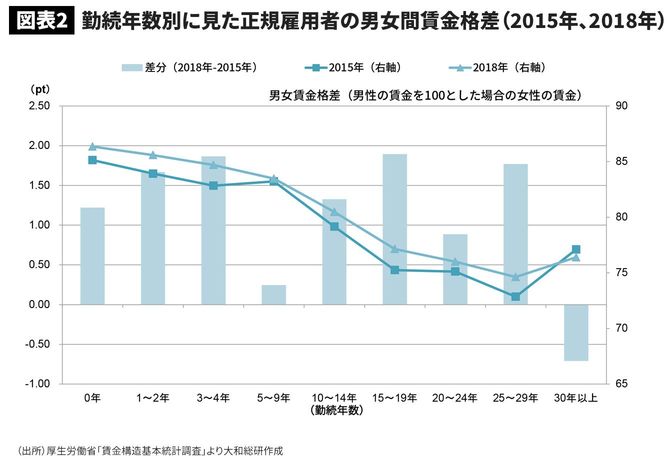 2018年における女性の賃金は、すでに入社時点で男性の86%程度の水準にとどまり、勤続年数が長くなるにつれて格差が拡大している。その理由はいくつか考えられるが、ここでは3点指摘したい。