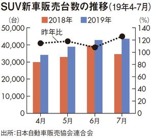 日本自動車販売協会連合会は2019年8月1日、7月の新車販売統計(速報)を発表した。調査によると、4~7月までの普通自動車および小型自動車におけるSUVタイプの売り上げは15万9108台(前年比116%)と伸長している。自動車ジャーナリストの永井隆氏は「人気上位の車種に共通するのは完全なクロスカントリー(オフロード用)ではなく街乗りタイプであることです」と指摘する。