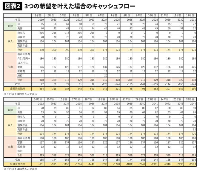 しかし、定年後は、収入が老齢年金と遺族年金だけになってしまうため、毎年144万円または155万円(旅行に行く年は164万円)の赤字が続きます。試算をすると定年4年目にして資金がショートしはじめ、9年目(母親73歳、長男48歳)となる2027年度中に預貯金180万円を使い果たしてしまう結果となりました(図表2)。