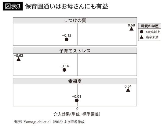 続いて、保育園通いがお母さんに及ぼす影響についても見てみましょう。図表3は、お母さんのしつけの質、ストレス、そして幸福度に対する保育園通いの影響を示しています。