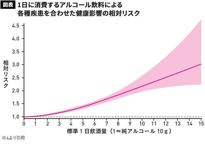 しかしながら、私の願望とはうらはらに、最近は少量の飲酒でも健康には悪影響があるという報告が多くなってきました。195の国・地域を対象にした2018年のメタ解析では「健康上の害を最小にするアルコールの消費量はゼロ」という結果でした(※4)。つまり、Jカーブ効果は観察できないのです。アルコールによる各種疾患のリスクをまとめたグラフでは、少量飲酒でリスクが下がることは示されません。