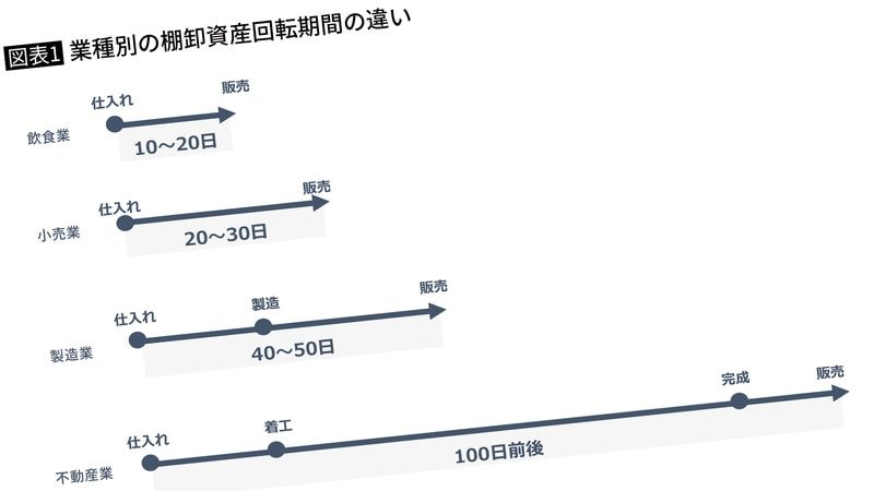 業種によって棚卸資産回転期間は大きく異なる。小売業の場合は20~30日程度、製造業の場合は製造工程が入る分、40~50日程度とやや長め。飲食業の場合は食材がメインなので、10~20日程度となるのが一般的だ(寿司チェーンなど保存できない食材を扱う飲食店であればもっと短いだろう)。