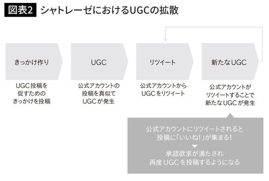 ここで公式アカウントがおこなったリツイートを見たユーザーが、「私もやってみよう」と、さらなるUGCを生み出します。今は、ひとつの投稿に対して、2000~3000のUGCが生まれています。これらの投稿から毎日3~5つのツイートを選んで、公式アカウントがリツイートしています。公式アカウントにリツイートされると、「いいね!」の数やリツイートの数が圧倒的に跳ね上がるので、ユーザーにも喜んでもらえ、再度UGCを投稿するユーザーが増えます。