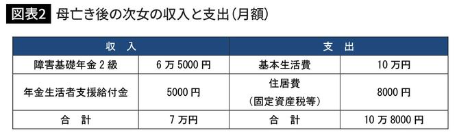 「収入は月7万円、支出は月10万8000円で、赤字は3万8000円です。お母様亡き後、ご次女が24年生きると仮定した場合の不足額は、3万8000円×12カ月×24年=約1100万円になります。急な入院やリフォームなどの一時的な支出がかかってしまったとしても、貯蓄の範囲内に収まる可能性が高いといえそうです」